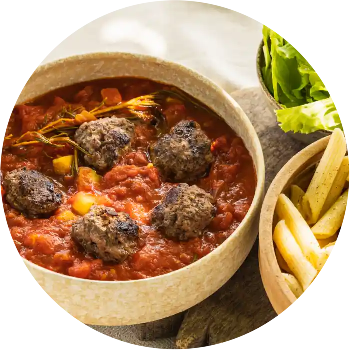 Nyd al dente pasta med smagfulde kødboller i en mild tomatsauce med grønt og rosmarin. Dertil en frisk grøn salat med rucola.