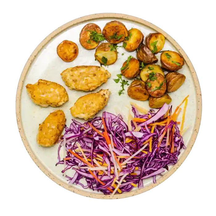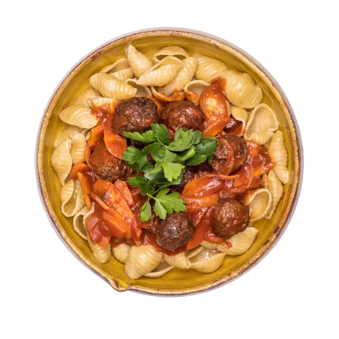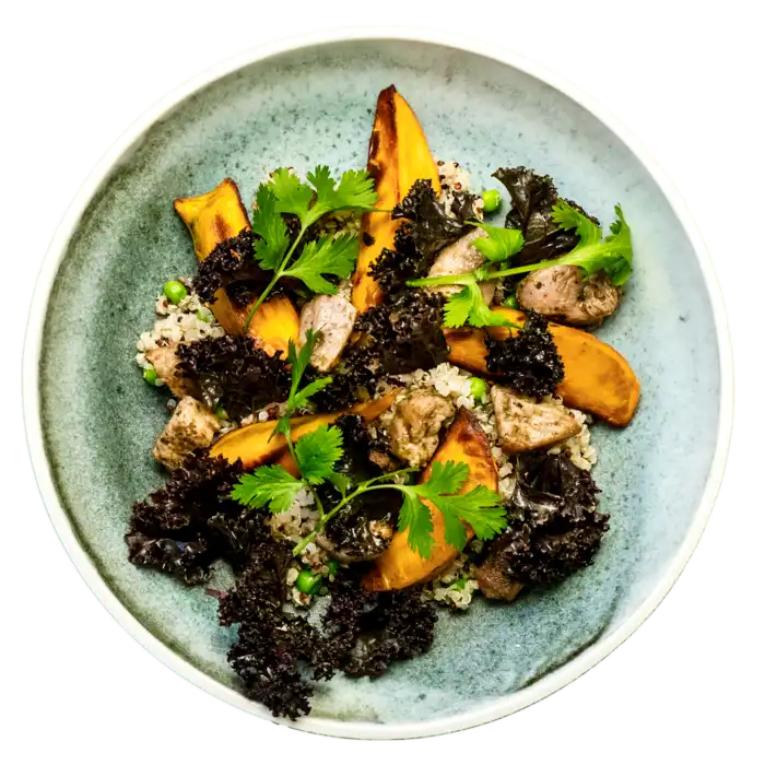 Måltiderne suppleres med bælgfrugter, ris, nødder, kerner, friske krydderurter, vores egne unikke krydderiblandinger samt udvalgte glutenfri kolonialvarer.