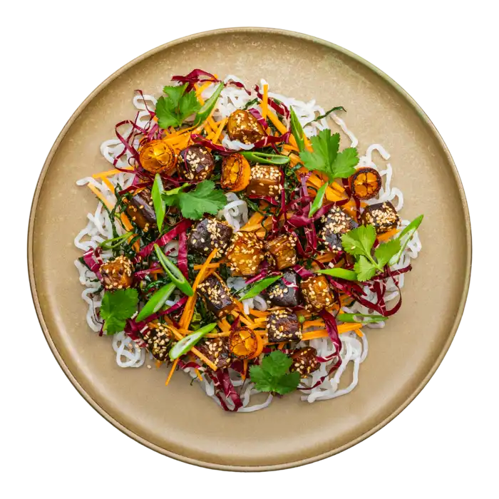 Grøntsagerne er i centrum, suppleret af vegetabilske proteiner som bælgfrugter, korn og ris samt spændende veganske specialiteter som falafelfars, gnocchi, seitan-tofu og pizzadej.