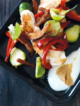 6. Kylling med skåret rosenkål, bacon og peanutbutter