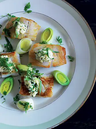 1. Stegt lyssej med porre, peberrodssmør og krydderurter